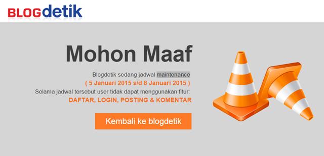 Seperti dikabarkan dari paltform dari detikcom ini, platform ini sedang melakukan jadwal maintenance dari tanggal 5-8 Januari 2015. Kabar yang mengejutkan bagi peserta tentunya. Mengingat waktu tersebut adalah pekan pertama Liga Blogger Indonesia.